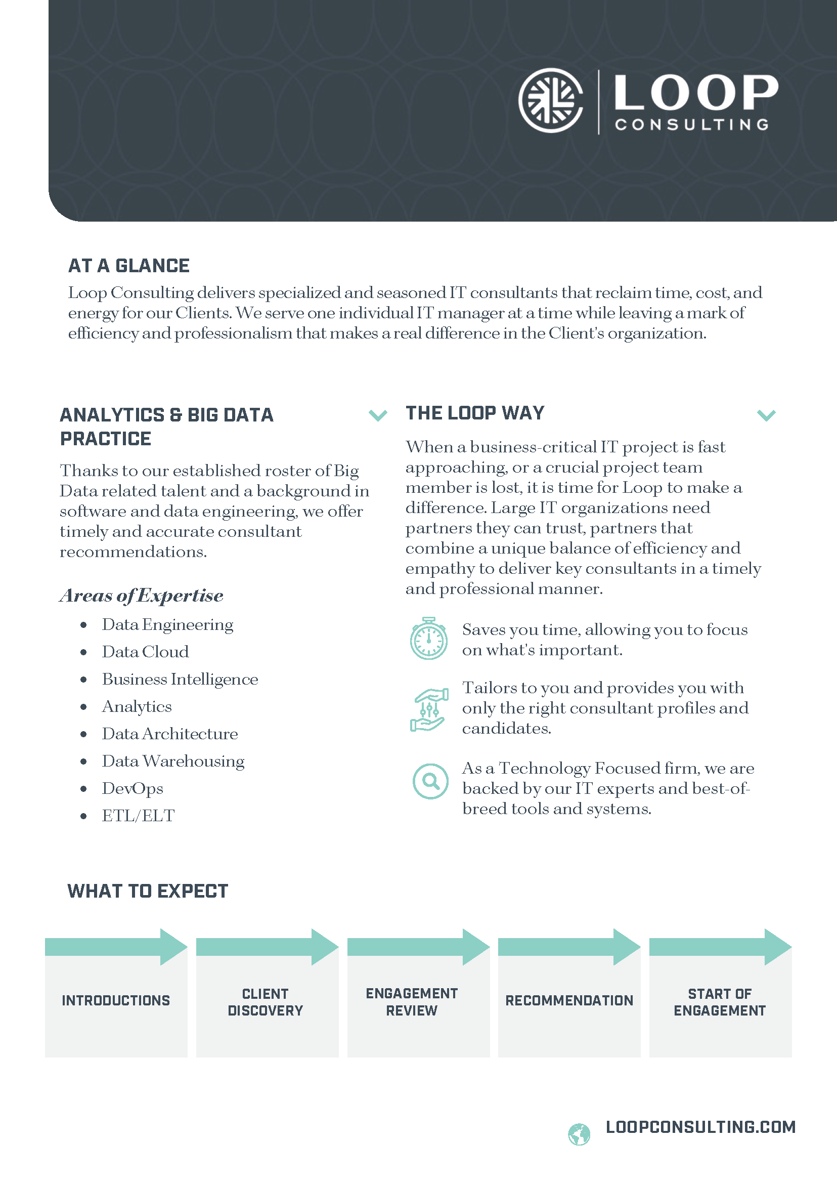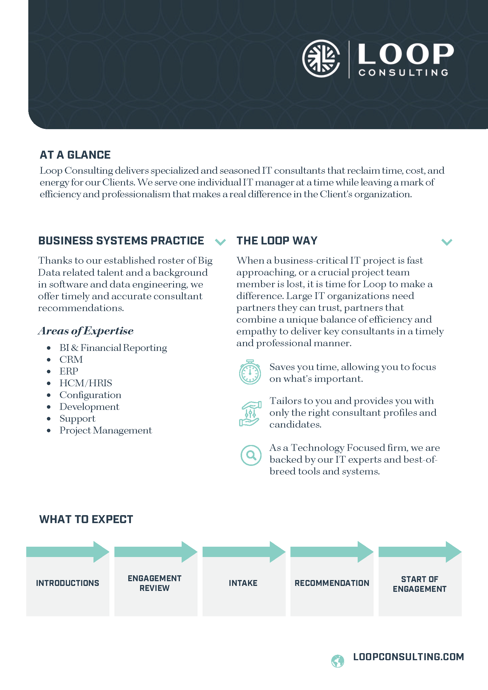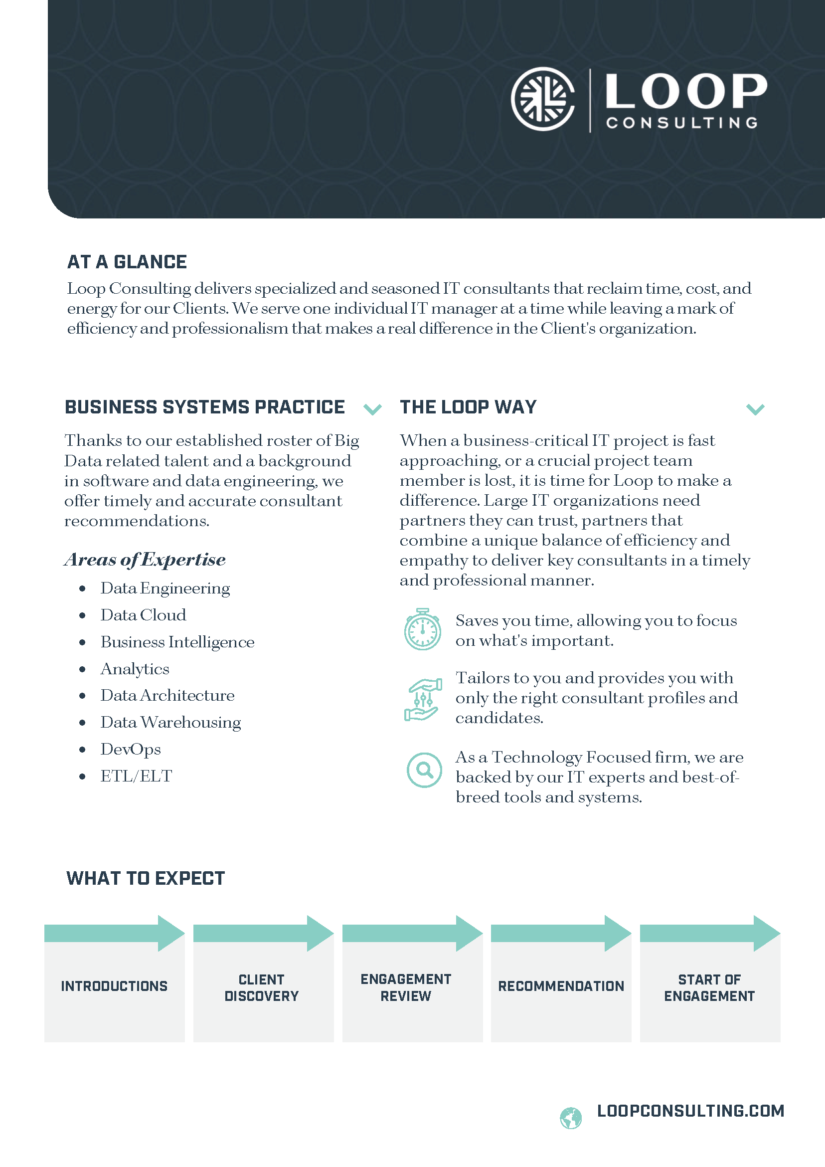 Loop’s IT Services practice is dedicated to filling technology resource gaps within organizations on both short and long-term timelines. This service is utilized most often by clients attempting to address evolving project demands, scale teams, or respond to peak workloads requiring specialized IT acumen. Our team distinguishes itself by providing access to our bench of consultants, presenting relevant options, and efficiently onboarding the resource selected to meet each client’s unique requirements.